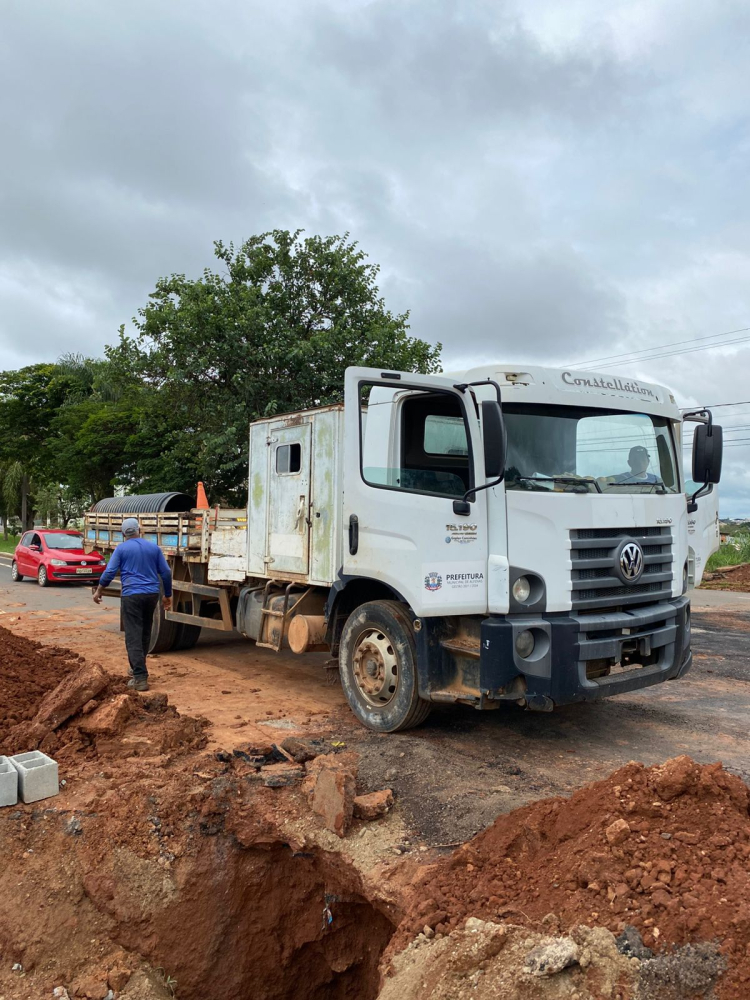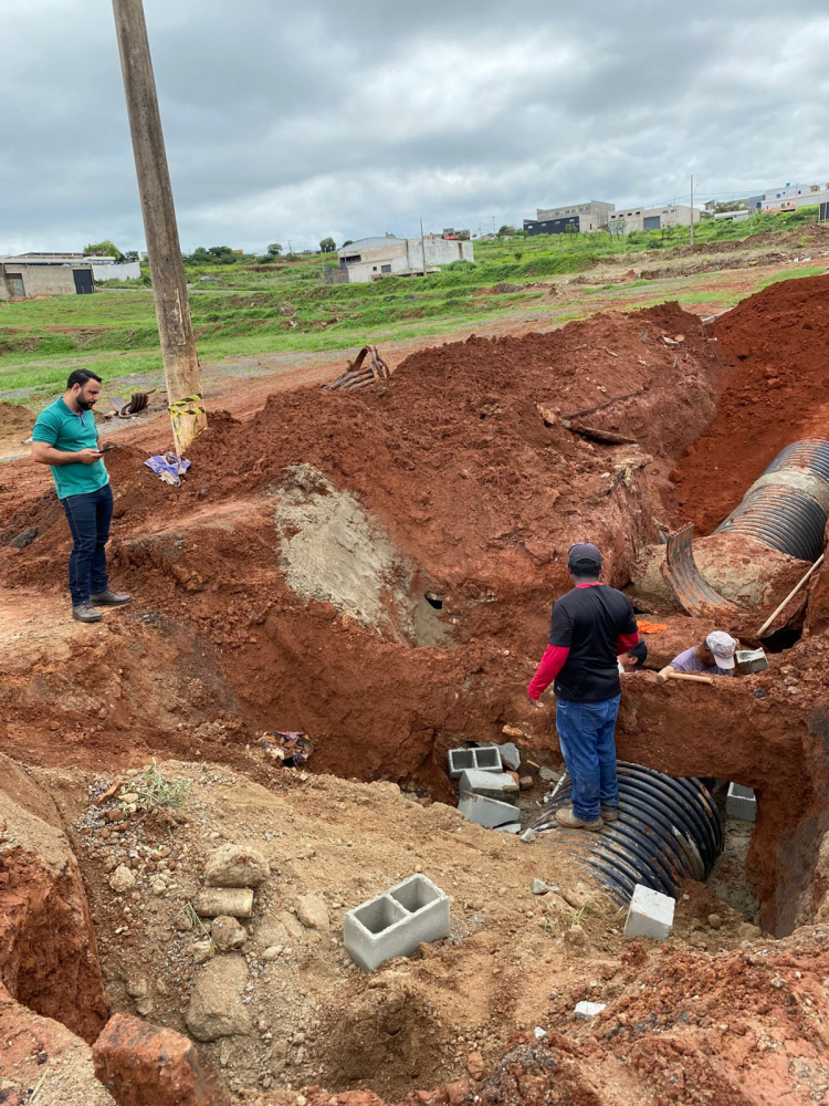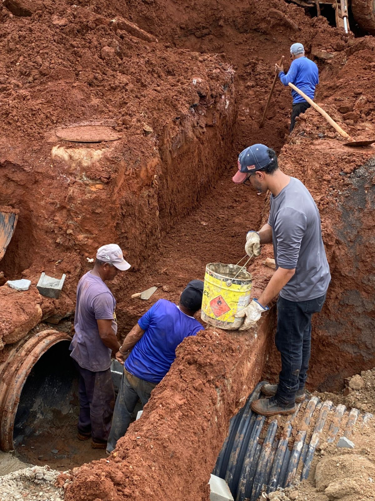 Equipe da Secretaria de Obras trabalha intensamente para que a obra seja concluída o mais breve possível para que a população do entorno não seja afetada pelas chuvas que causam o aumento do volume de água pluvial no local.