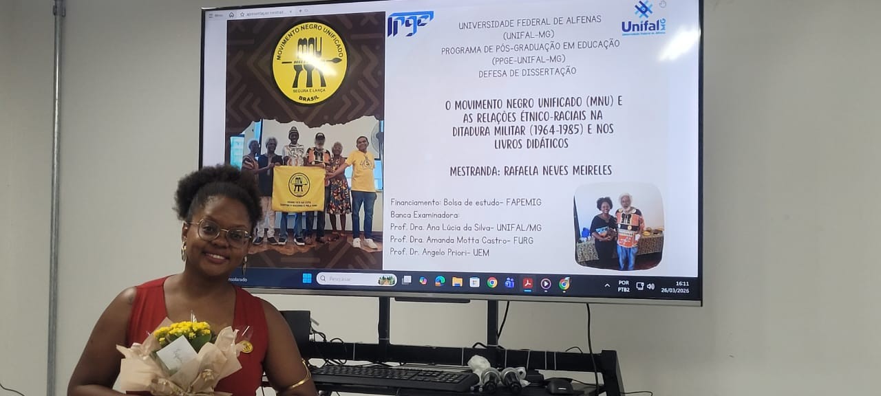 Com o apoio da família e a orientação da Profa. Doutora Ana Lúcia da Silva, Profa. Rafaela defendeu e teve aprovada sua dissertação do Mestrado em Educação pela UNIFAL-MG, com o tema “O movimento negro unificado (MNU) e as relações étnico-raciais na ditadura militar (1964-1985) e nos livros didáticos”.