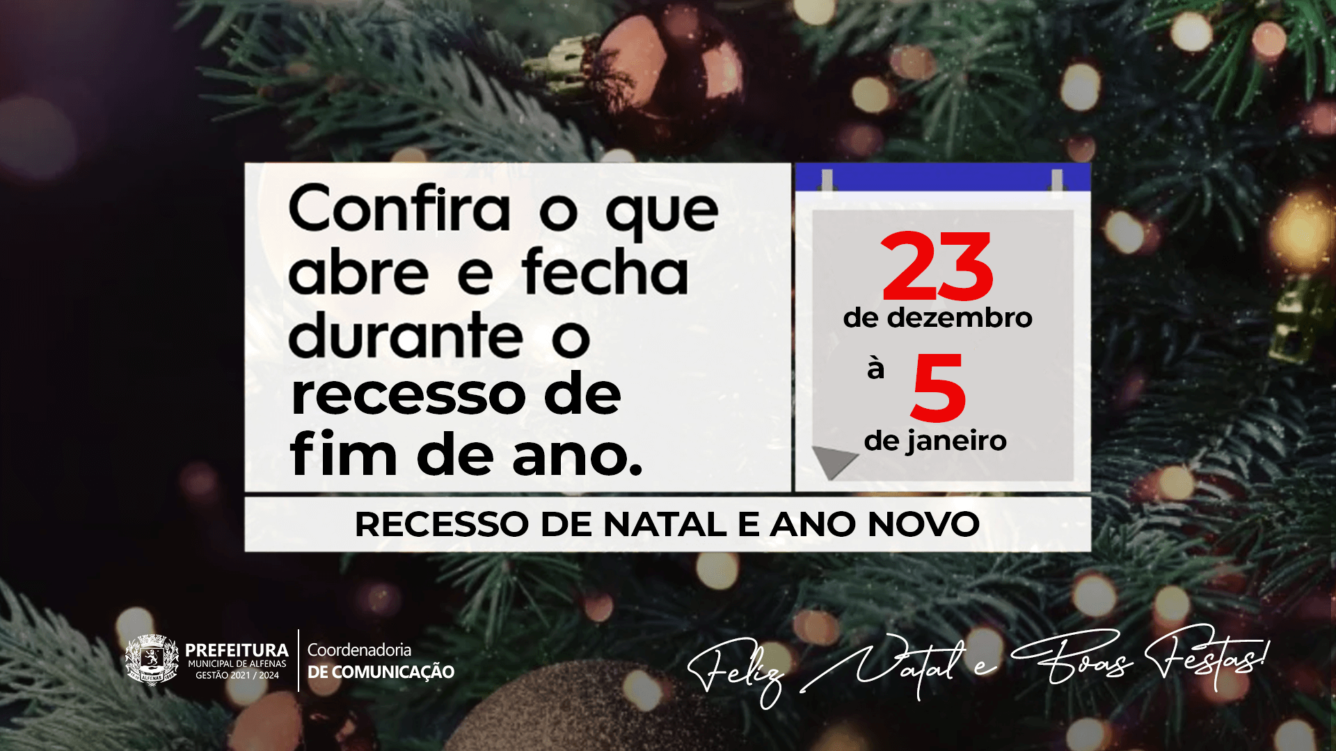 A Prefeitura Municipal de Alfenas informa o funcionamento dos serviços municipais durante o recesso de final do ano. De acordo com o Decreto Municipal Nº3.510 publicado em 24 de novembro de 23 e o Decreto Municipal Nº 3.649 de 26 de novembro de 2024, não haverá expediente no prédio da Prefeitura do dia 23 de dezembro de 2024 a 05 de janeiro de 2025.