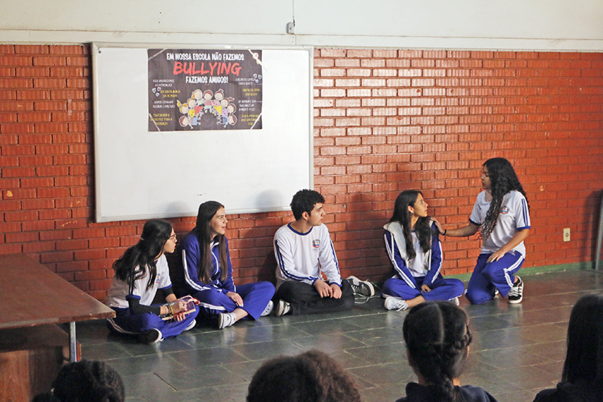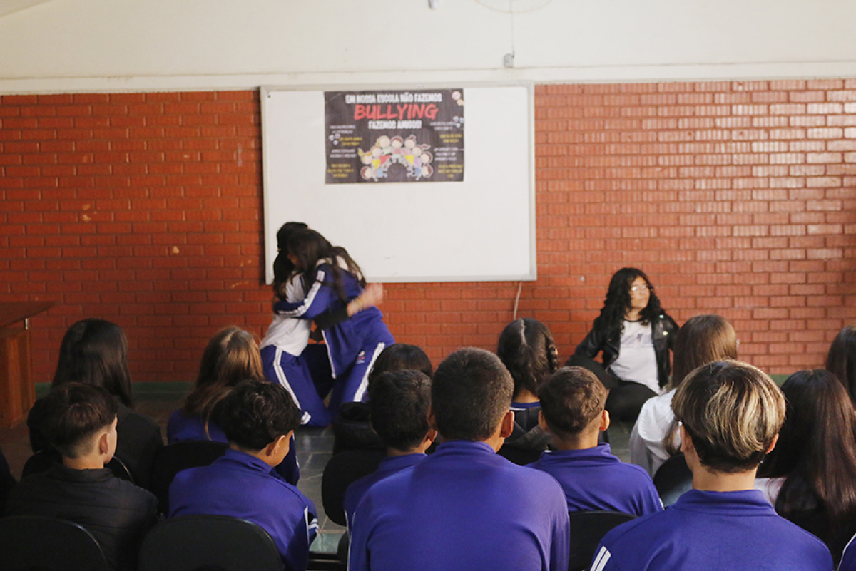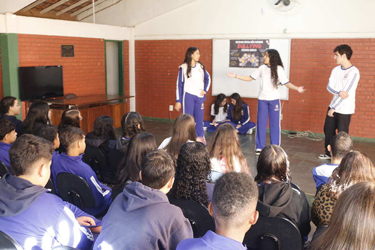 A peça, encenada por um grupo de teatro local -(Polivalente EM CENA)em parceria com a equipe diretiva e pedagógica da escola, retratou situações comuns vividas por estudantes, como exclusão, apelidos ofensivos e agressões verbais.
